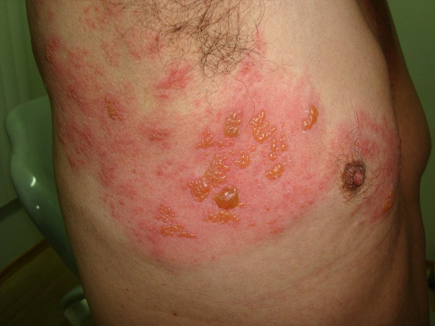El dolor focalizado (leve o intenso se desencadena y prolonga ante pequeños estímulos) precede y acompaña al brote ampolloso que es descrito como: quemazón, hormigueo o ardor. La erupción es bastante característica por su distribución en zonas unilaterales (lados derecho o izquierdo) correspondientes a los dermatomas. Luego de unos diez días las ampollas forman costras y dejan de ser contagiosas. En raras ocasiones el herpes zóster carece de brote, es diseminado o forma costras gruesas de larga evolución.